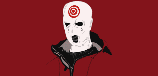 • A bold digital drawing showing a masked man's face with a bullseye painted on his forehead. The red background enhances the sense of danger, tension, and focus.A bold digital drawing showing a masked man's face with a bullseye painted on his forehead. The red background enhances the sense of danger, tension, and focus.